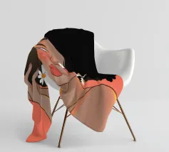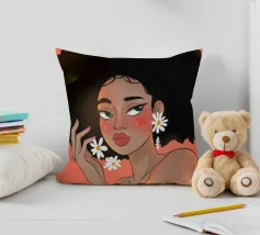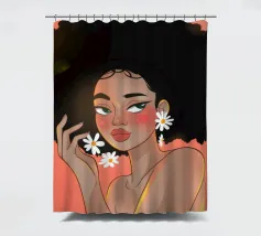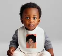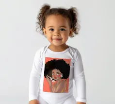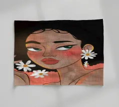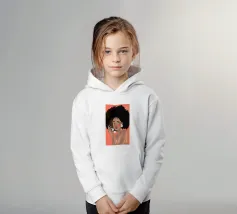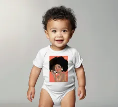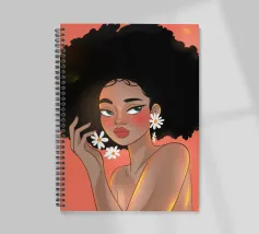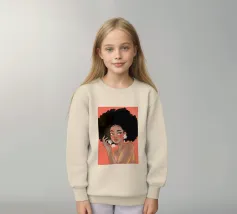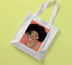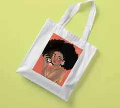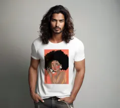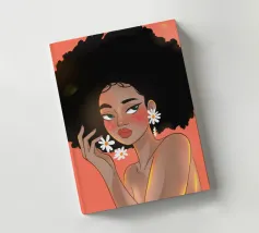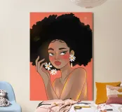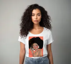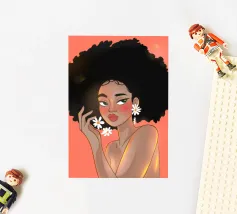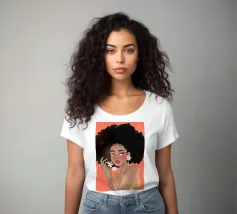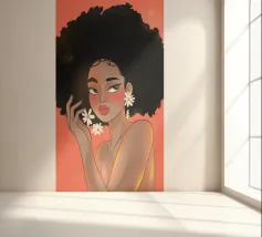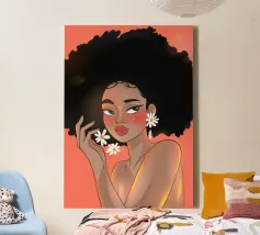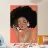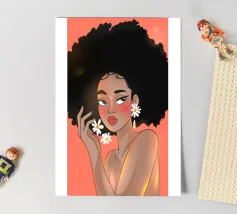 Questo dipinto raffigura una persona con una grande e voluminosa acconciatura afro. Lo sfondo è di un vivace arancione e la persona è adornata con orecchini floreali bianchi e un top giallo. La persona tiene una mano vicino al viso, creando una posa aggraziata.