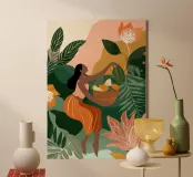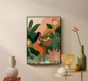 Circondata da foglie rigogliose e fioriture radiose, si protende delicatamente verso un albero carico di frutti. Il cielo si illumina di calde sfumature dorate, come l'interno di un mango appena aperto. C'è abbondanza qui, non solo in ciò che raccoglie, ma anche nel modo in cui si muove: lento, costante e pieno di cura. Un momento di connessione con la terra, il ritmo e il nutrimento.