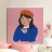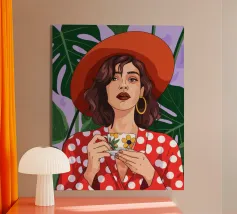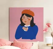 Un affascinante ritratto di una donna con un berretto rosso e un maglione blu, che sorride mentre tiene in mano una tazza di caffè. Lo sfondo rosa tenue e l'espressione dolce della donna creano un'immagine piacevole e accessibile.