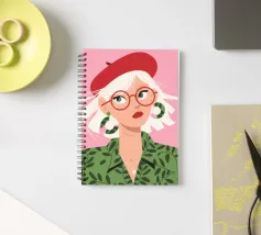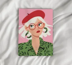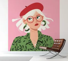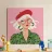 Questo dipinto ritrae una persona elegante con un berretto rosso e una camicia verde con motivi a foglia. Lo sfondo rosa pieno fa risaltare l'estetica audace dell'abbigliamento.