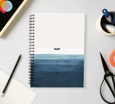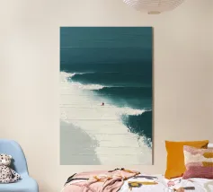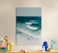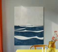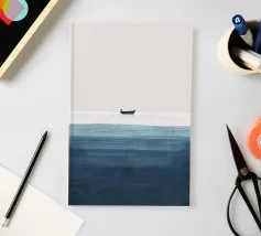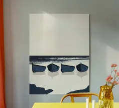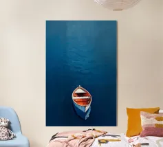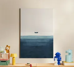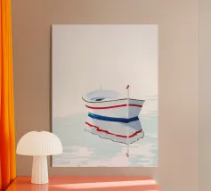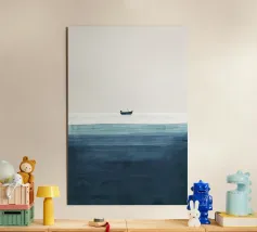 Quest'opera d'arte è uno studio sul minimalismo e sull'equilibrio spaziale, dove l'ampio spazio negativo diventa significativo quanto la forma stessa. Una piccola barca solitaria poggia su un orizzonte sottile e luminoso, dividendo la composizione in regni di luce e profondità. In alto, un ampio campo chiaro suggerisce aria, immobilità e apertura; in basso, toni stratificati di blu profondo evocano peso sommerso e tranquilla incertezza.