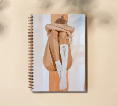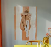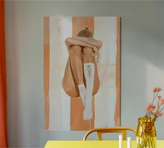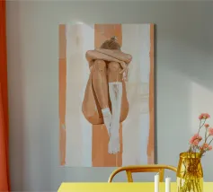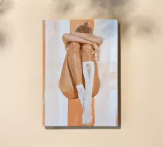 Quest'opera presenta un potente studio di vulnerabilità e introspezione attraverso un approccio pittorico contemporaneo. La figura è ripiegata verso l'interno, con le braccia strette intorno al corpo, formando una forma chiusa, quasi scultorea, che parla di autocontenimento e rifugio emotivo. Le calde tonalità della carne contrastano con le forti bande verticali di bianco e arancione tenue, creando uno sfondo ritmico che rafforza la tensione e l'equilibrio.