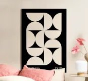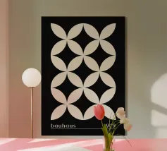 A bold, modern poster featuring striking black geometric shapes on a crisp white background. The design emphasizes balance, contrast, and clean lines, creating a visually engaging composition that is both sophisticated and versatile. Perfect for contemporary interiors, offices, or creative spaces, this print brings a touch of modernist elegance and minimalist style to any room.
