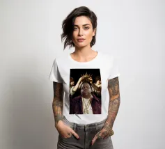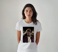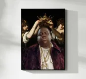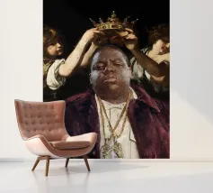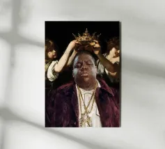 "Biggie King eleva la figura iconica del rapper Notorious B.I.G. a nuove vette in un collage giocoso che lo incorona come uno degli artisti più influenti della musica. Due putti, presi direttamente da iconici dipinti barocchi, affiancano il rapper, elevandolo allo status di regalità musicale. Questo pezzo è un tributo audace e creativo alla grandezza del rap e all'impatto duraturo del suo artista più leggendario".