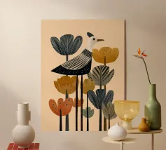 Un design moderno con un uccello stilizzato e fiori astratti. L'estetica chiara e i colori armoniosi conferiscono calma e stile alla vostra casa - perfetto per gli amanti della natura e del design!