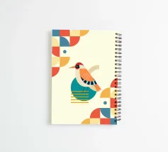 A stylized bird with a geometric design sits prominently against a pale background, surrounded by colorful abstract shapes. The vibrant palette includes shades of red, blue, yellow, and orange, contributing to a playful and modern aesthetic.