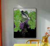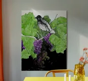 Bird perches on a branch with grapes plexiglass