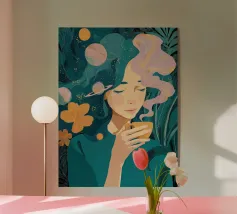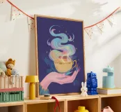 This artwork shows a hand holding a yellow teacup with swirling steam. The background is dark with mystical elements, creating a sense of enchantment and mystery.
