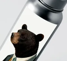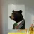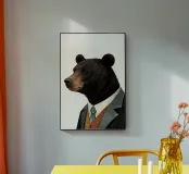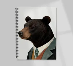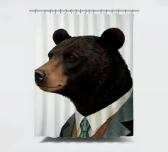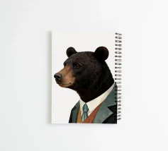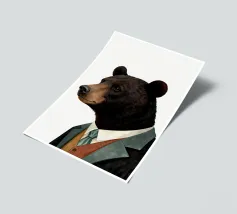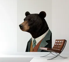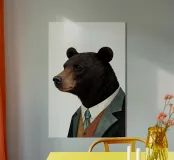 Ritratto realistico ad acquerello di un orso nero vestito con un abito elegante e una cravatta a righe verde acqua, immortalato in un profilo elegante su uno sfondo bianco puro.