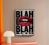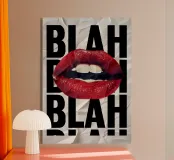 "Un paio di labbra rosse, lucide e vibranti, posizionate tra le parole 'BLAH' impilate verticalmente in una tipografia nera e audace su uno sfondo bianco e pulito, creano una dichiarazione giocosa e sprezzante. Il contrasto tra le labbra realistiche e il testo grafico aggiunge un tocco pop art.",