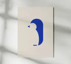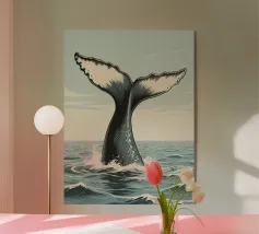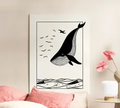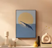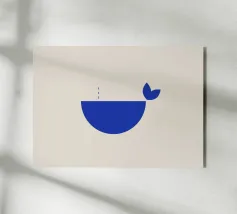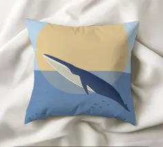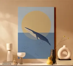 Illustrazione minimalista di una balena blu di fronte a un tramonto