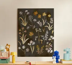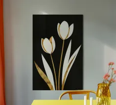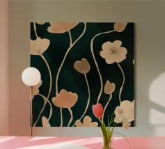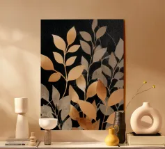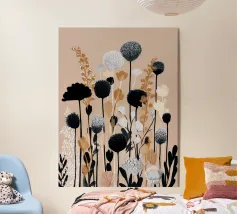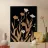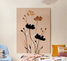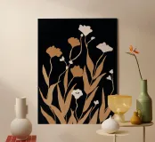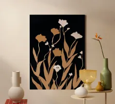 Un'audace composizione botanica in cui caldi steli ocra e morbidi fiori bianchi emergono su uno sfondo nero profondo. Il gioco di luci e ombre di questo pezzo minimale conferisce un senso di tranquilla eleganza, perfetto per gli stili di interni contemporanei, monocromatici o lunatici.