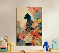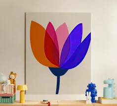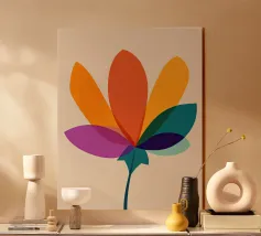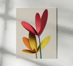 Un'audace fusione di geometria astratta e morbidezza organica, questa composizione floreale cattura l'essenza di un fiore in movimento dinamico. La sovrapposizione di petali traslucidi nei colori caldi del rosso, del corallo, dell'ocra e del carbone crea un accattivante senso di profondità e di flusso. Il pulito sfondo beige enfatizza la presenza scultorea dello stelo e del fiore, offrendo un equilibrio armonioso tra colore e calma. Perfetto per gli interni moderni che cercano un tocco artistico.