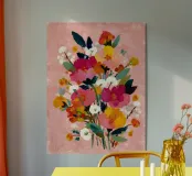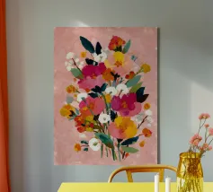 Un vibrante bouquet di fiori corallo, rosa e arancione che esplode di allegria e colore. Perfetto per ravvivare interni moderni ed eclettici.