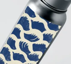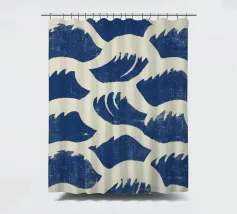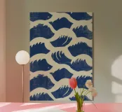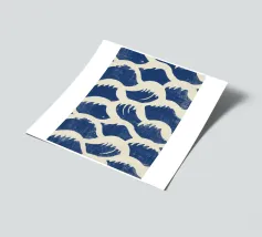Un motivo ripetuto di linee curve in blu scuro e bianco sporco. La texture leggermente irregolare ricorda le pennellate e crea profondità. Simmetrica e armoniosa, la composizione trasmette calma, ritmo e movimento organico.