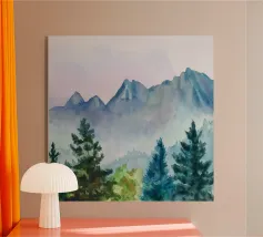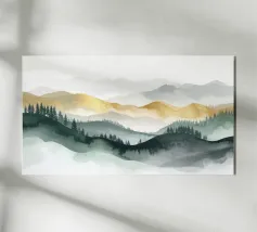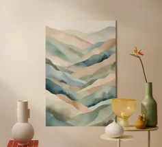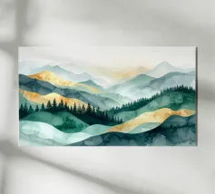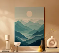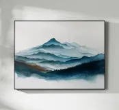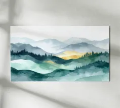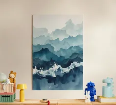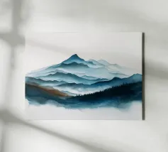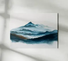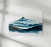 Morbidi strati di creste nebbiose si estendono all'orizzonte in questa scena di montagna minimalista ad acquerello. Con gli indaco profondi, i blu ardesia e la nebbia delicata, l'opera evoca il silenzio, la scala e la solitudine: perfetta per gli interni tranquilli, per l'arredamento delle baite o per gli amanti degli spazi aperti e selvaggi.