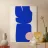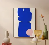 Forme astratte blu sono impilate verticalmente, contrastate da una piccola bolla rosa posizionata in basso. La composizione utilizza elementi di design minimali per creare interesse visivo attraverso il colore e la forma.