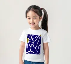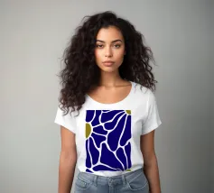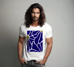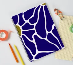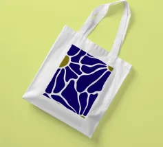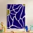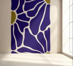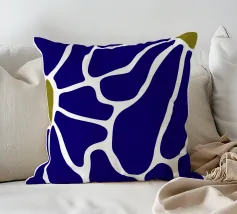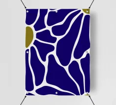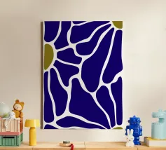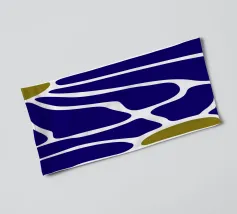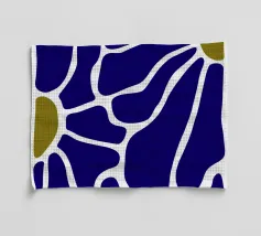 Un motivo audace presenta forme irregolari e interconnesse in blu intenso con bordi bianchi, accentuati da piccole aree di verde oliva. La disposizione ricorda una rete stilizzata, creando un senso di movimento e di flusso.