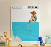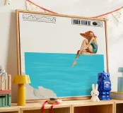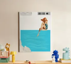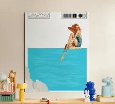 La settima opera della serie "Timeless Femininity" emana una leggerezza estiva e un'eleganza sognante. Una donna in costume da bagno turchese è seduta sul bordo di una piscina, con le gambe immerse nell'acqua che brilla di un blu cristallino. La sua posa è rilassata, un sorriso le illumina le labbra mentre si gode il momento di tranquillità. Il blu brillante dell'acqua occupa la maggior parte della composizione e trasmette una sensazione di ampiezza e serenità. Un delicato bordo bianco nella parte inferiore dell'immagine completa la scena.