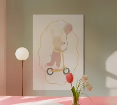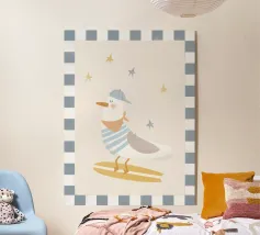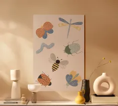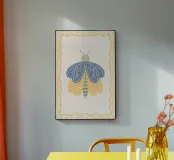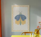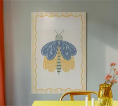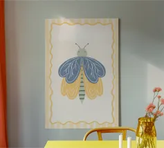 Una delicata illustrazione di una falena nei toni del blu tenue, giallo caldo e verde salvia smorzato, collocata al centro di una cornice gialla ondulata di tendenza con sottili dettagli a righe. Questa moderna opera d'arte dedicata agli insetti aggiunge un tocco delicato ma giocoso alle camerette dei bambini, alle stanze dei neonati e agli spazi a tema botanico. Perfetta per creare un'atmosfera tranquilla e ispirata alla natura per i più piccoli.