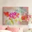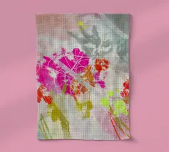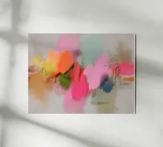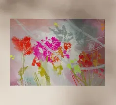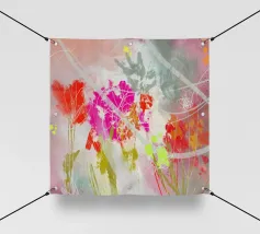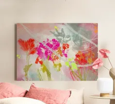 Quest'opera d'arte cattura in modo impressionante la transitorietà temporale della natura. I colori vibranti del rosso, del rosa e dell'arancio contrastano armoniosamente con i blu e i grigi tenui dello sfondo. Gli elementi floreali sembrano danzare mentre sono collegati da linee curve, creando un movimento dinamico e gioioso. La sottile texture dà vita ai colori e invita lo spettatore a scoprire un mondo di spensierata leggerezza che celebra la bellezza della natura.