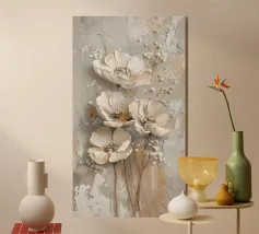 Il colore applicato crea una texture vivace, quasi tangibile, che infonde vita ai fiori. Nonostante le pennellate decise, il dipinto irradia una struttura calma che pone lo spettatore in un dialogo tranquillo con la natura. I colori blu e bianco si armonizzano perfettamente e trasmettono una sensazione di pace e innocenza. Quest'opera d'arte è un'ode alla bellezza tranquilla e travolgente della natura, toccante nella sua semplicità e profondità.