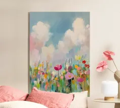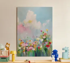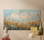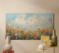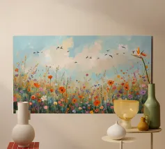 Ein modernes, expressives Gemälde einer sommerlichen Wildblumenwiese. Am unteren Bildrand dicht blühende, abstrakt gemalte Wildblumen in kräftigen, harmonischen Farben. Darüber ein weiter, pastellblauer Himmel mit weichen Farbverläufen und einer Gruppe ziehender Zugvögel in zarten, freien Silhouetten.