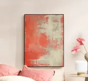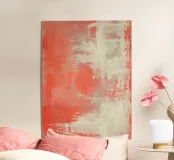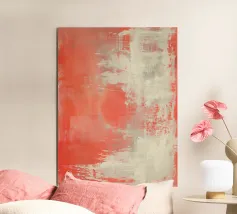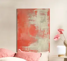 Una composizione astratta contemporanea costruita con tonalità corallo stratificate, ammorbidite da sovrapposizioni di bianco traslucido e crema caldo. La superficie rivela una texture sottile, transizioni sfumate e delicate tracce verticali. L'opera trasmette un'atmosfera suggestiva piuttosto che aggressiva. Il corallo appare diffuso, parzialmente nascosto sotto strati chiari, creando profondità senza forti contrasti.