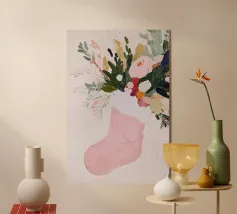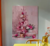 Stampa romantica dell'albero di Natale nei toni del rosa. Arte murale bohémien che unisce eleganza e spirito di festa.