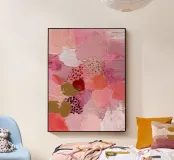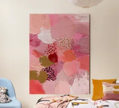 Un dipinto astratto dai toni delicati, composto da sfumature rosa sovrapposte e pennellate espressive. Le texture morbide e gli accenti caldi creano un'opera d'arte tranquilla ma vivace, perfetta per gli interni moderni.