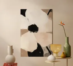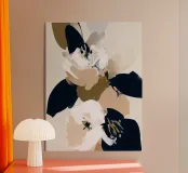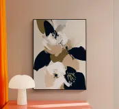 Una composizione floreale dinamica con petali morbidi e arrossati in contrasto con tratti neri decisi e foglie color oliva intenso. Le pennellate espressive e i contrasti grafici rendono questo pezzo un complemento elegante e di grande effetto per ambienti moderni, minimalisti o di ispirazione monocromatica.