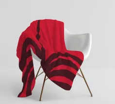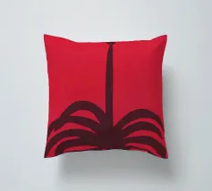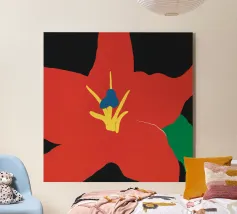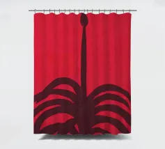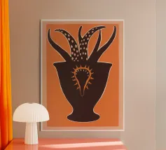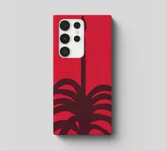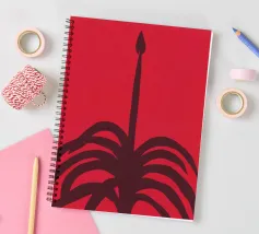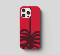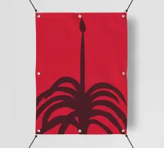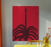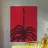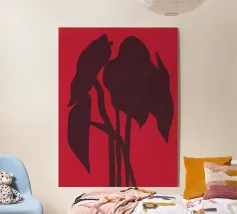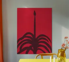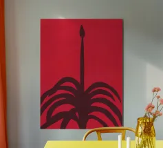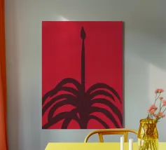 La silhouette di una pianta contrasta nettamente con uno sfondo rosso vibrante, con foglie lunghe e ricurve e un singolo stelo appuntito che si estende verso l'alto. L'uso audace del colore e le forme decise creano un impatto visivo notevole.