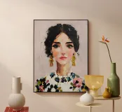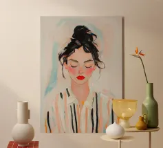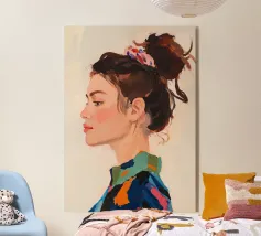 Un ritratto femminile dall'animo profondo, con pennellate espressive e orecchini d'oro. Questo pezzo incarna una tranquilla sicurezza e una bellezza moderna, ispirata all'estetica di Anthropologie e al massimalismo romantico.