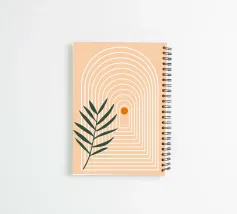 A minimalist and modern poster that combines organic natural forms with clear geometry. At the centre is a series of white, interlaced round arches that extend into the depths like a tunnel and give the design a strong spatial effect. A small orange circle glows in the centre - a symbol of the sun, energy or inner balance. In the foreground, a dark green leaf with fine branches contrasts with the geometric rigour of the arches. This interplay of nature and structure creates a harmonious balance between calm and dynamism.