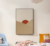 Geometria del deserto - Sole, sabbia e forme silenziose ☀️📐 Questo poster astratto comprime un intero paesaggio in tre elementi ridotti: un sole semicircolare di colore rosso vivo, due aree sovrapposte di colore beige e marrone chiaro che sembrano dune dolcemente incurvate e un cielo vuoto, bianco crema, al di sopra. La composizione affascina per la sua semplice eleganza: nessun dettaglio, solo forma e colore. Lo sfalsamento orizzontale crea profondità, mentre l'arco solare emerge visivamente dalla sabbia: un simbolo di calore, chiarezza e armonia naturale.