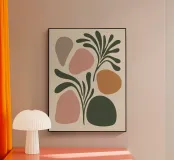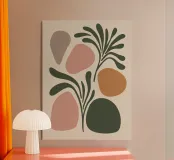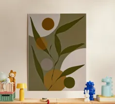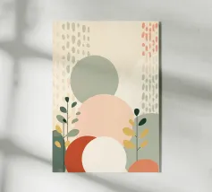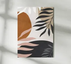 Una miscela armoniosa di natura e astrazione moderna, questo disegno presenta una foglia delicata completata da forme morbide e organiche in una tavolozza di colori pastello. Perfetto per aggiungere un tocco di tranquillità ed eleganza a qualsiasi spazio, questo pezzo di ispirazione boho incarna semplicità ed equilibrio.