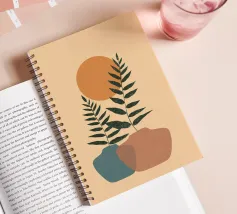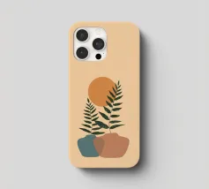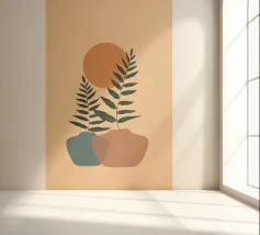 Scoprite l'elegante design dei "vasi Boho". Quest'opera d'arte minimalista ma accattivante presenta due eleganti piante in vaso con foglie lunghe e ricurve disposte in vasi di forma diversa: uno blu e uno marrone. Sullo sfondo spicca un grande disco circolare di colore arancione, che rappresenta simbolicamente il sole e dona calore e vivacità alla scena. Lo sfondo beige costituisce una base calma e neutra che lascia trasparire i colori delle piante e dei vasi, creando un quadro d'insieme armonioso e moderno.