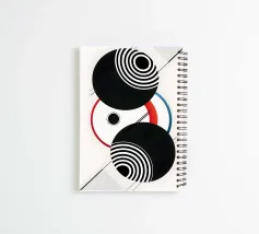 Bold geometric shapes dominate the composition, featuring intersecting circles with black, white, red, and blue colors. The design incorporates a sense of movement through the use of stripes and concentric patterns.