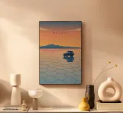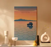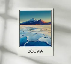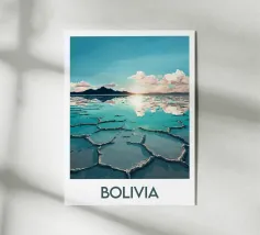 Disegno di viaggio minimalista della Bolivia con il famoso deserto di sale Salar de Uyuni. Questo motivo tipico del paesaggio boliviano è perfetto per tutti i viaggiatori sudamericani che amano i viaggi su strada e il mondo.