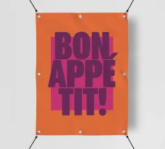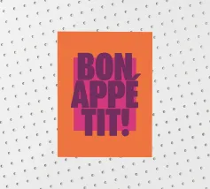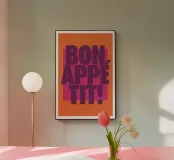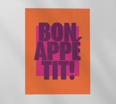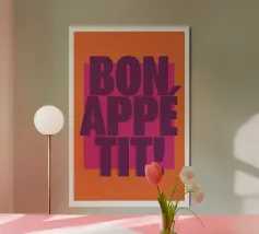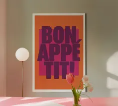 L'immagine presenta un design grafico audace e vivace con il testo "BON APPÉTIT!" in evidenza. Il testo è scritto in grandi lettere maiuscole di colore viola. Lo sfondo è costituito da un rettangolo arancione che contrasta con un rettangolo rosa più grande, creando un contrasto cromatico di grande effetto. Il design complessivo è semplice ma accattivante e l'uso giocoso del colore e della tipografia crea un'atmosfera allegra e invitante, perfetta per decorare una cucina o una zona pranzo.
