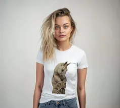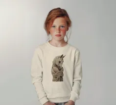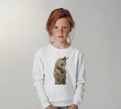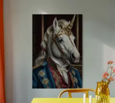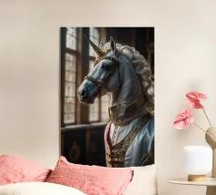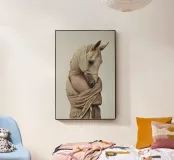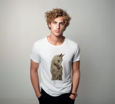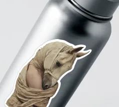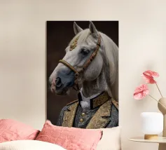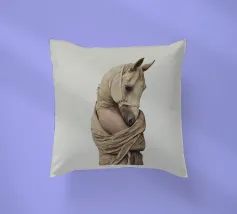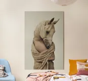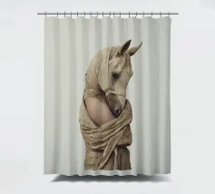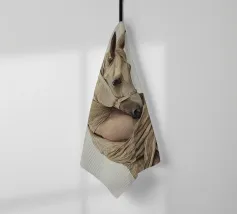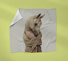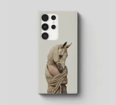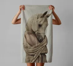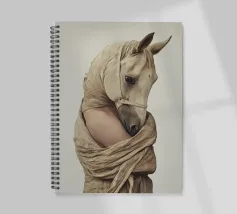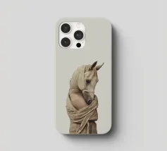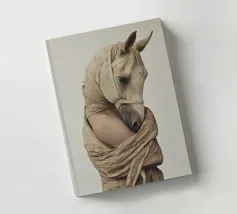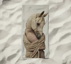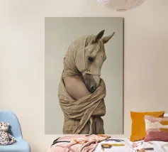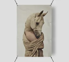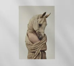 Un'immagine surreale che raffigura una figura umana con la testa di un cavallo, elegantemente avvolta in un tessuto beige strutturato. La composizione trasmette mistero, maestria e un senso di simbolismo ultraterreno, fondendo elementi umani e animali.