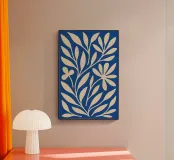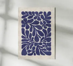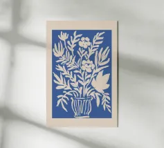 Un vivace sfondo blu fa da sfondo alle forme botaniche di questo moderno poster grafico. Le forme floreali beige fluttuano sulla tela come foglie al vento, creando contrasto e movimento visivo. L'opera d'arte fonde palette di colori mediterranei e chiarezza scandinava, offrendo un pezzo fresco ed elegante per gli amanti della natura e del minimalismo.