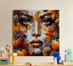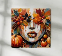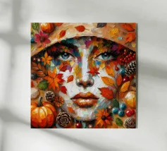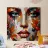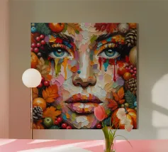 Un ritratto vibrante e materico del volto di una donna, realizzato in uno stile che ricorda la pittura a impasto, in cui vengono applicati spessi strati di pittura per creare un effetto tridimensionale. Il volto è composto da varie macchie di colore in tonalità calde come arancio, rosso e marrone, bilanciate da tonalità più fredde come blu e grigio.