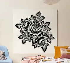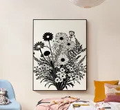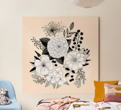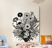 Una composizione botanica in bianco e nero presenta un assortimento di fiori selvatici e fogliame intricato e intrecciato. La composizione cattura varie forme e dimensioni, creando un ricco arazzo di elementi floreali.
