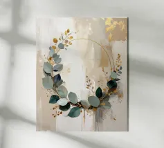 Una serena stampa astratta di arte botanica con foglie stilizzate, rami delicati e morbidi dettagli dorati su uno sfondo color crema.