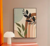 Foglie stilizzate in nero e verde si stagliano su uno sfondo di strisce curve e fluide in morbide tonalità di terra. Il disegno combina elementi botanici con forme geometriche astratte per un look moderno.