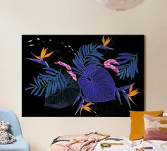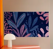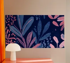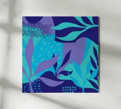 Una composizione botanica astratta che risplende di profondi toni indaco e corallo radioso. Foglie stratificate e texture punteggiate emergono dall'oscurità, creando un gioco ritmico tra ombra e luce. Questo pezzo combina la spontaneità pittorica con un design raffinato, evocando un'atmosfera onirica da giardino sottomarino.