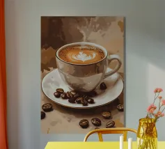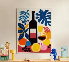Due bottiglie di vino, un bicchiere di vino rosso e uva fresca su uno sfondo di foglie di vite verdi: questa classica natura morta è un omaggio al piacere, all'artigianato e alla natura. I colori tenui e la rappresentazione realistica rendono il motivo particolarmente adatto a cucine, sale da pranzo o cantine. Ideale per gli amanti del vino, i sommelier o come regalo per gli intenditori.