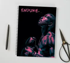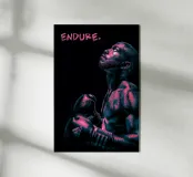 Il poster presenta un potente primo piano di un pugile, il cui corpo brilla di sudore e determinazione. L'illuminazione drammatica nei toni del viola e del nero crea un effetto audace, quasi cinematografico, sottolineando la forza e la perseveranza del pugile. La parola "ENDURE." in una tipografia robusta e schizzata rafforza il messaggio centrale: il successo inizia con la resistenza.