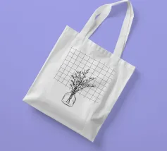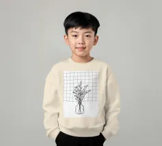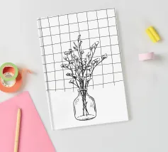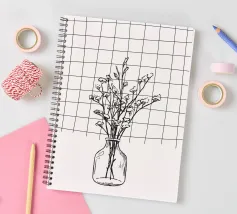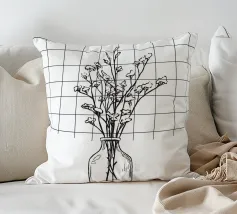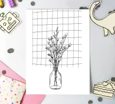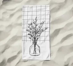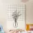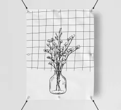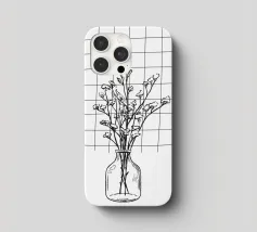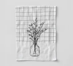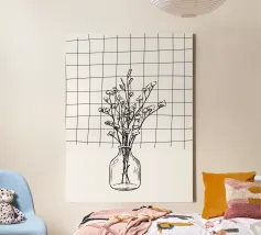 Delicati rami con piccoli fiori sono disposti in un semplice vaso di vetro. Lo sfondo presenta un motivo a griglia che aggiunge un contrasto strutturato alle forme organiche dei fiori.